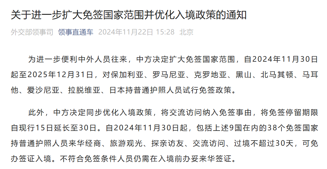 此外,中方決定同步優化入境政策,將交流訪問納入免籤事由,將免籤停留期限自現行15日延長至30日。自2024年11月30日起,包括上述9國在內的38個免籤國家持普通護照人員來華經商、旅遊觀光、探親訪友、交流訪問、過境不超過30天,可免辦簽證入境。不符合免籤條件人員仍需在入境前辦妥來華簽證。