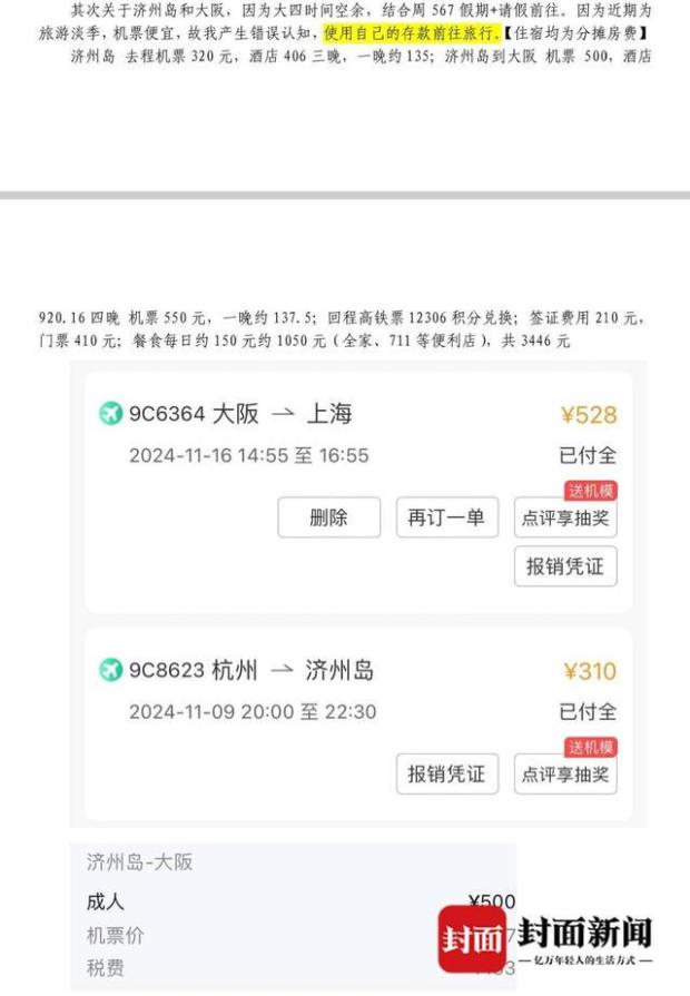 對於輿論關注的多次國內外旅行部分,該自述稱,青海、新疆、阿壩、成都等處為出新聞任務以及社會實踐,並未旅遊,照片為拍攝沿途風景;蘇州、麗水(縉雲)、泉州和廈門以及海南三亞均為因私出行,費用多出自勤工助學及獎學金;山東、大連、濟州島、大阪、雲南等地則是使用自己存款進行窮遊,如雲南21天旅行花費3890元,濟州島和大阪7天花費3446元。並附帶相關機票截圖和費用明細。自述出示的收入明細顯示,累計勤工助學1100小時,收入22021元;累計獎學金6000元;學校資助累計12800元;暑期家教所得11900元。