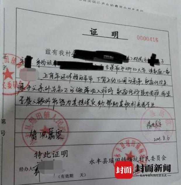 為確認證明材料及證明內容是否屬實,記者就此致電永豐縣民政局瞭解情況,工作人員稱經鎮村兩級調查核實,該生2021年家庭情況與證明一致。