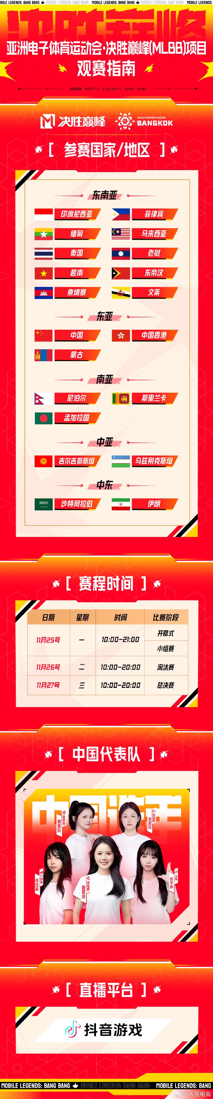 @人民電競 11月23日發佈消息,亞洲電子體育運動會·決勝巔峯女子項目中國代表隊名單公佈,“中國女子電競代表隊首次為國出征”。