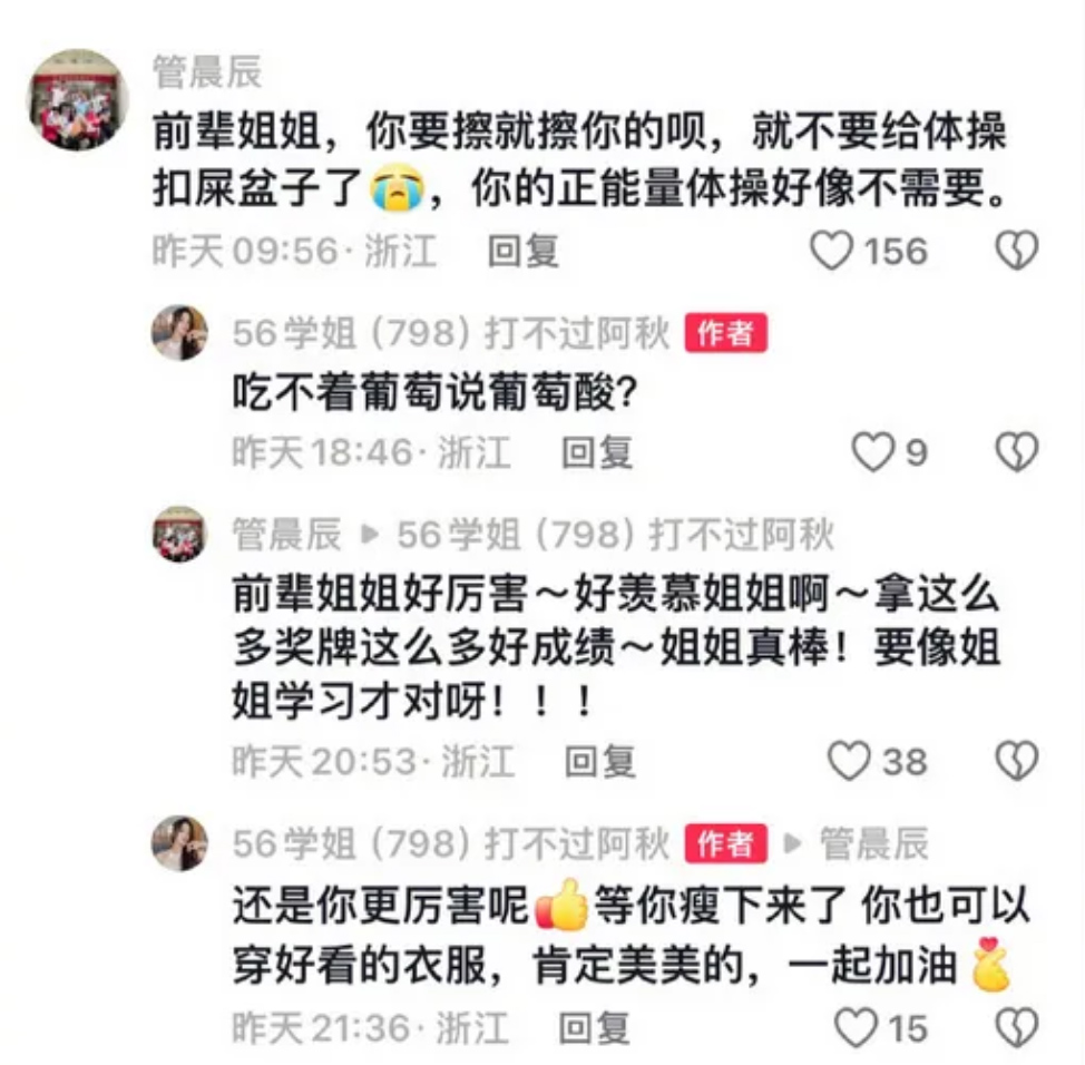 此前在吳柳芳一條視頻的評論區,管晨辰曾經留言稱:“前輩姐姐,你要擦就擦你的唄,就不要給體操扣屎盆子了”。吳柳芳回應道:“吃不着葡萄説葡萄酸?”