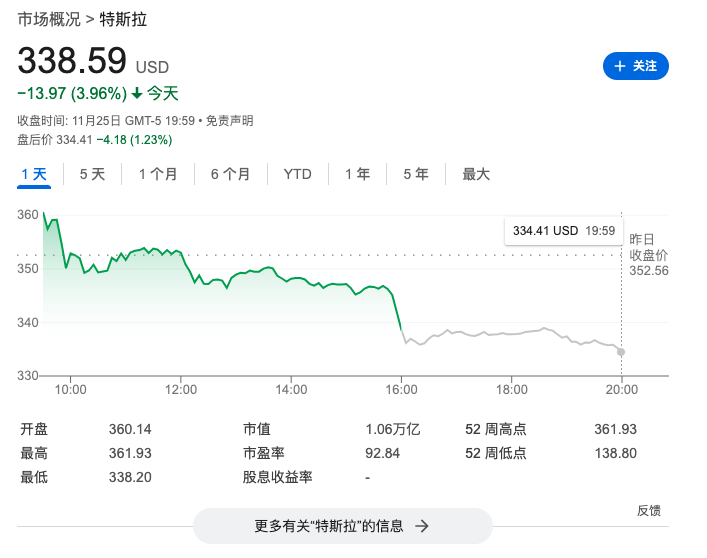 當地時間11月25日,特斯拉報338.59美元,跌3.96%,市值一夜之間蒸發約440億美元,約合人民幣超3200億。