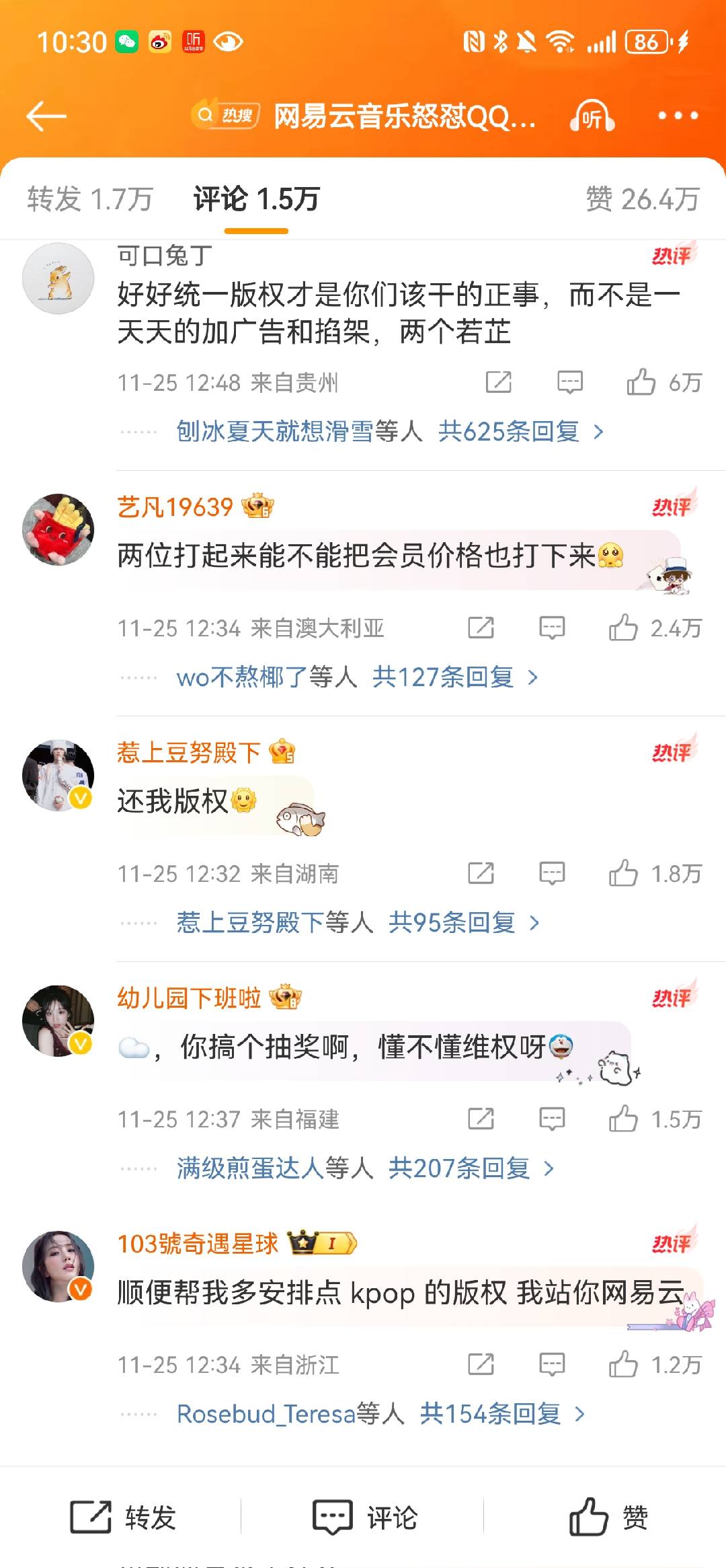 在今年的最新混戰背後,雙方微博評論區不乏吃瓜羣眾。從熱評來看,有網民開玩笑地表示,誰搞好版權和降價支持誰;但也有網民表示,“好好統一版權才是你們該乾的正事,而不是一天天的加廣告和掐架”,這條評論得到了6萬條微博網民點贊。