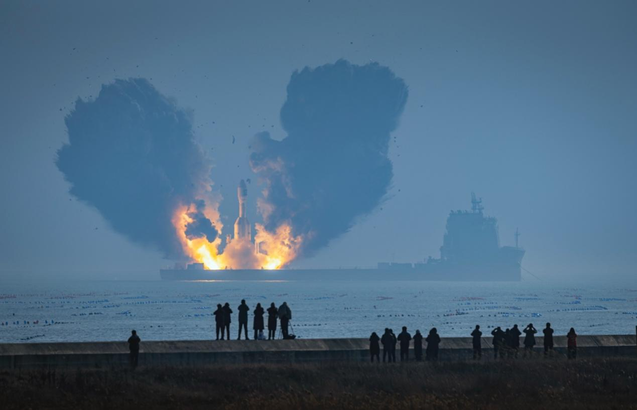 東方航天港在山東海陽近岸實施全球最大固體火箭引力一號首飛試驗。