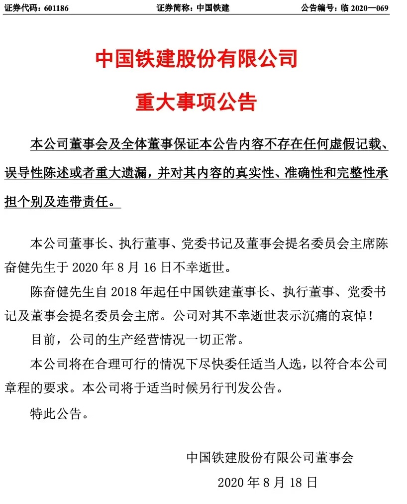 值得一提的是,2020年8月16日,中國鐵建前董事長陳奮健墜樓身亡,官方沒有通報具體原因。