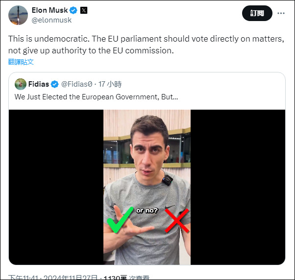 馬斯克批歐盟:你們這個機制,一點都不民主
