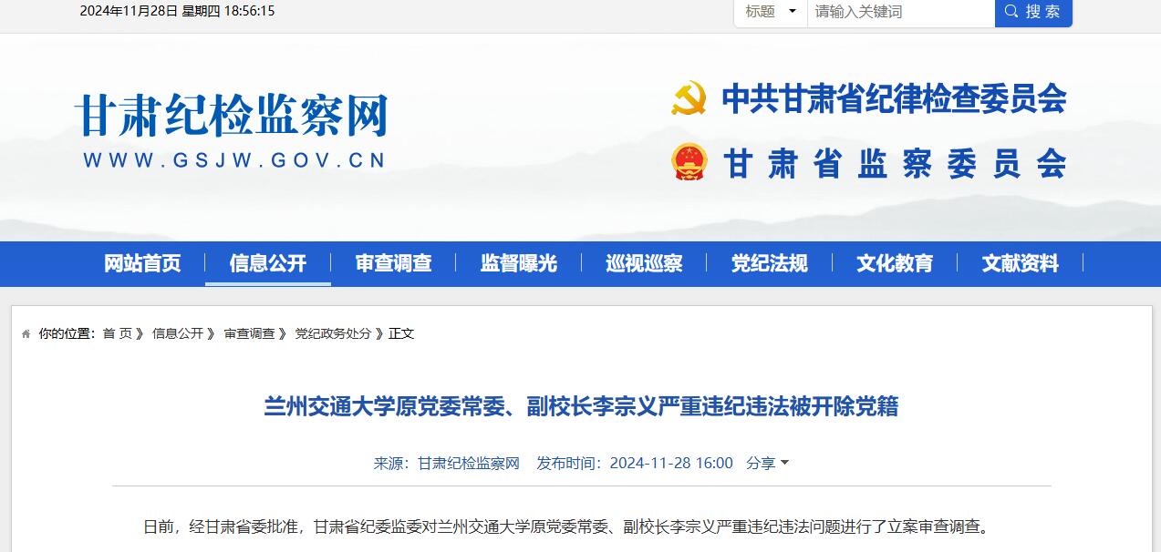 據甘肅省紀委監委網站11月28日消息:日前,經甘肅省委批准,甘肅省紀委監委對蘭州交通大學原黨委常委、副校長李宗義嚴重違紀違法問題進行了立案審查調查。