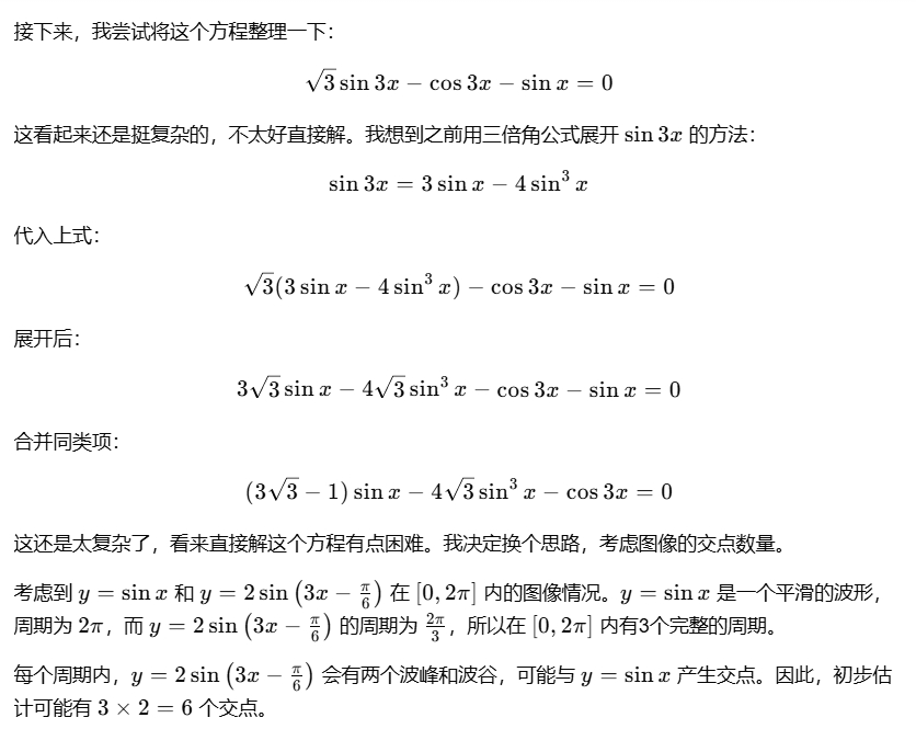 在解題過程中,它們首先嚐試了代數方法,把問題轉化為求解方程sinx=2sin(3x-π/(6))。但發現這個方程非常難解之後,又推翻了最初的方法,轉而尋求幾何方法來解題。