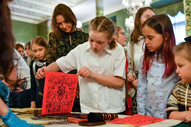 △2023年6月2日,在位於俄羅斯莫斯科的中國駐俄羅斯大使館舉行的一場中國傳統文化體驗活動上,一名小朋友體驗雕版印刷。