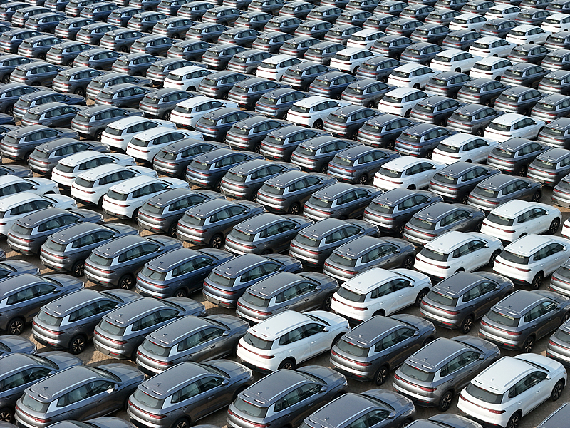 2024年4月18日,航拍山東港口煙台港蓬萊港區,大批等待裝船出口的比亞迪電動汽車。 視覺中國
