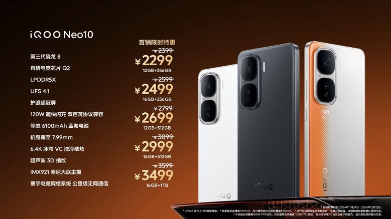 iQOO Neo10系列共有“拉力橙”、“馳光白”和“疾影黑”三種配色可選,全系列發佈即開售,Neo10 Pro提供12GB+256GB、12GB+512GB、16GB+256GB、16GB+512GB和16GB+1TB五種存儲組合可選,到手價3199元起;Neo10提供12GB+256GB、12GB+512GB、16GB+256GB、16GB+512GB和16GB+1TB五種存儲組合可選,到手價2299元起。