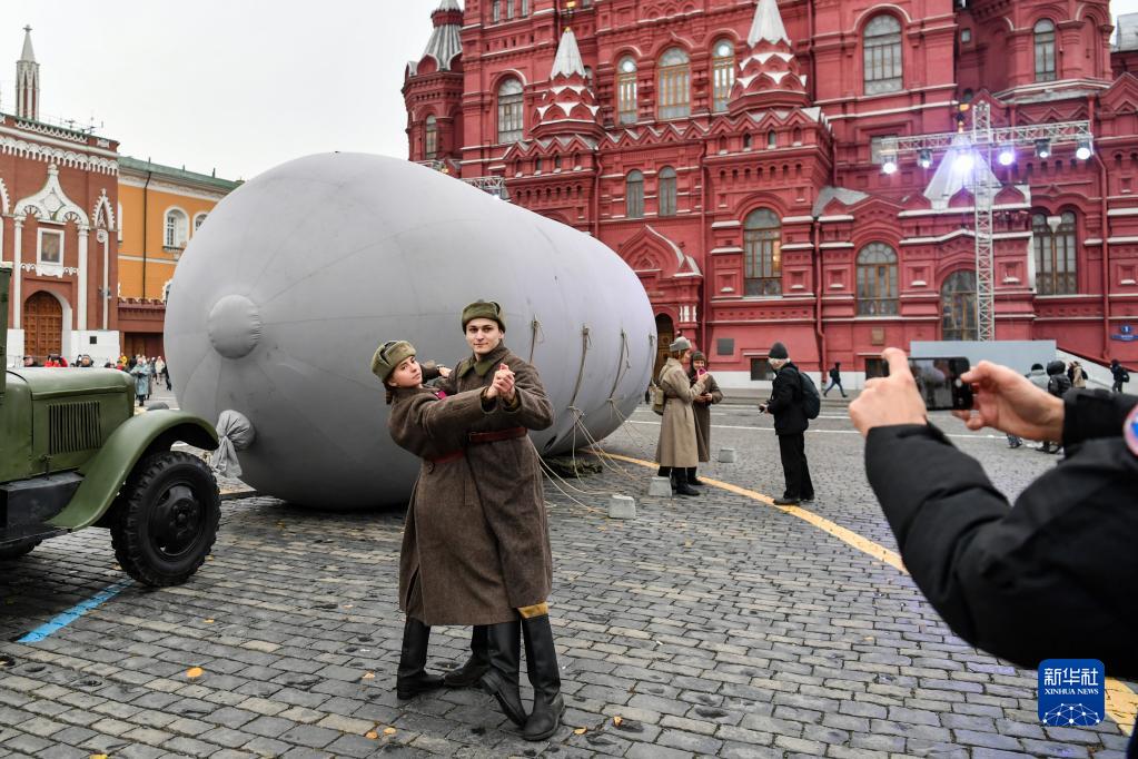 2022年11月7日,在俄羅斯首都莫斯科,人們參觀以紀念1941年蘇聯紅場閲兵式為主題的露天展覽。 新華社