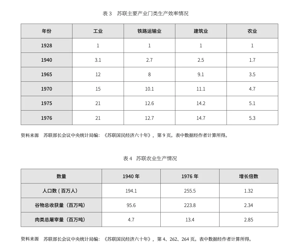 蘇聯工業化生產的國內循環在工業與農業生產之間可以得到進一步的驗證(見表3)。從蘇聯主要產業門類的生產率來看,工業部門的勞動生產率增長最為迅速,建築業、鐵路運輸業次之,農業部門的勞動生產率的增長長期低於其他部門。如果從農業產出量來看,農業產出量的增長倍數確實不如同時期工業品,這也印證了蘇聯經濟體系“過重”的特點。