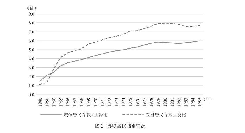 從蘇聯居民自身來看,用於儲蓄的資金總量也在持續增長。以儲蓄工資比為例,到了1985年,每個蘇聯城鎮、農村居民的儲蓄金額分別是城鎮、農村居民工資的6倍、7.7倍,即平均每個蘇聯城鎮居民的儲蓄額為6個月的工資,而平均每個蘇聯農村居民的儲蓄額為其7.7個月的工資(見圖2)。