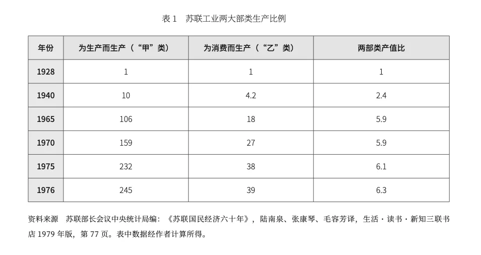 從工業化正式開始到1991年解體,蘇聯從未偏離過斯大林時期制定的工業化策略,即它一直在重工業的內部進行國內循環。這種特徵在蘇聯的經濟結構中表現得尤為突出(見表1)。