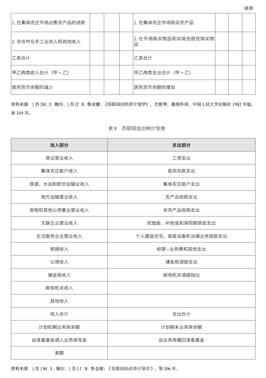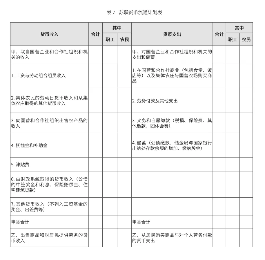 在計劃外資金的籌措方面,蘇聯國家銀行扮演了至關重要的角色,而其籌措資金的主要工具有賴於貨幣流通計劃(見表7)和現金出納計劃(見表8)。蘇聯國家銀行在計劃制定之初,預先確定信貸計劃,並根據信貸計劃來制定貨幣流通計劃和現金出納計劃。