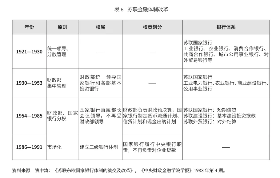1986年起,戈爾巴喬夫開始推行蘇聯金融體制市場化改革,蘇聯國家銀行履行中央銀行職責,1990年貨幣信貸權下放到各加盟共和國,至此蘇聯為重工業化建立的金融制度徹底走向終結(見表6)。