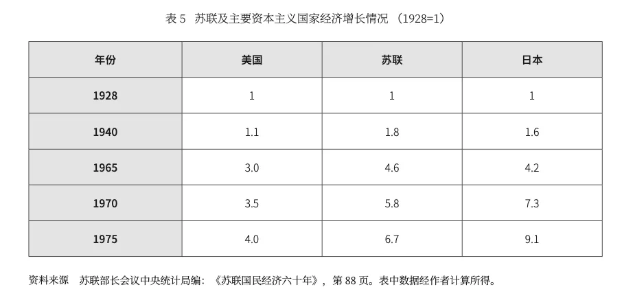 在工業化的過程中,蘇聯傾其全力推動重工業部門的快速擴張。這樣的工業化仍然面臨着另外一個難題,即如何籌措重工業部門快速擴張所需的資金。當然,蘇聯工業化初期的啓動資金中有很大比例來自國外貸款。但在第二次世界大戰後,美國對蘇貸款流產,蘇聯通過外部世界獲取重工業化資金的渠道大大縮減,但從蘇聯與主要資本主義國家的經濟增長對比來看(見表5),資金的縮減並未減緩蘇聯工業化的步伐。