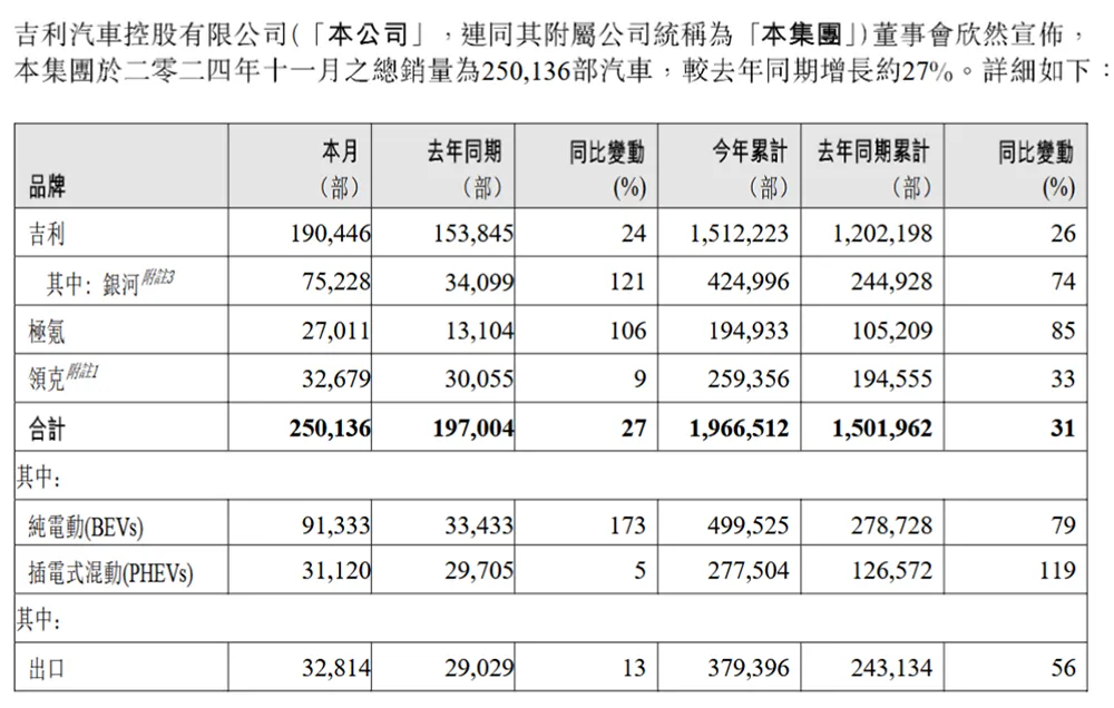 而吉利汽車也維持了高速增長的勢頭。得益於銀河品牌和極氪品牌的熱銷,吉利汽車11月銷量超過了25萬輛,截止至11月30日的銷量數據已經非常接近原先定下的200萬年銷目標。