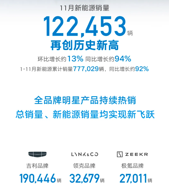 吉利汽車11月銷量 吉利汽車產銷快報