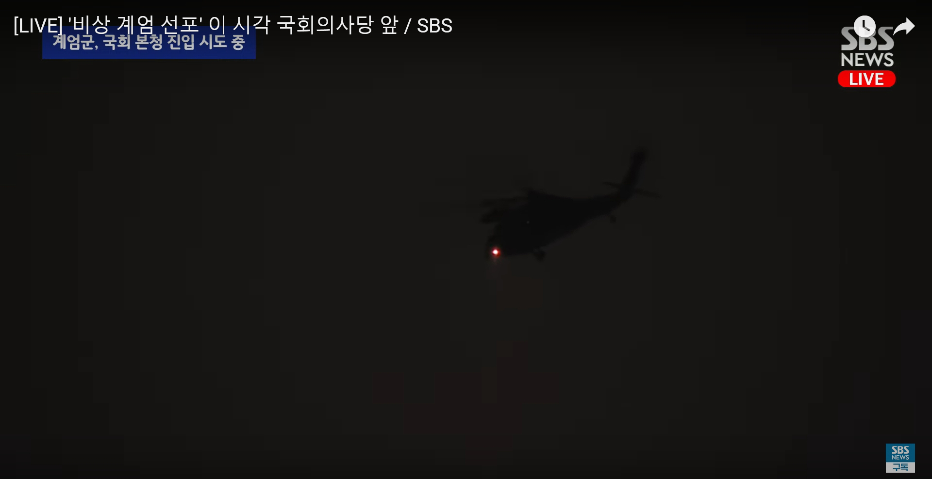 從韓媒現場直播畫面可以看到,國會上空有飛機盤旋。有目擊者稱,當晚11時46分左右,有3架疑似軍用直升機飛過上空並進入國會範圍,還有目擊者稱直升機上下來的士兵手持槍支。