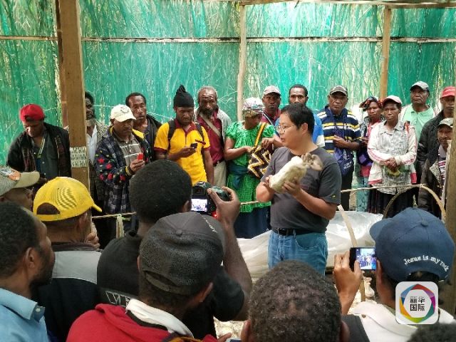 2018年9月4日,在巴布亞新幾內亞東高地省戈羅卡市中國福建省援巴新菌草與旱稻技術合作項目基地,項目組組長林應興向當地民眾講解菌草種植技術。 新華社