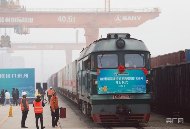 1月16日,贛州國際陸港開行首列臍橙出口班列(央廣網發 楊曉明 攝)