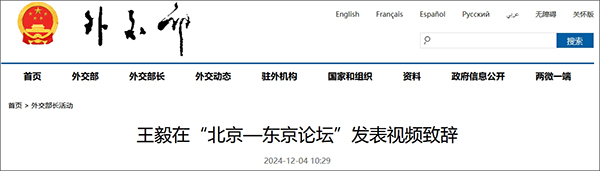 據外交部網站消息,12月4日,中共中央政治局委員、中央外辦主任王毅在第20屆“北京—東京論壇”發表視頻致辭。