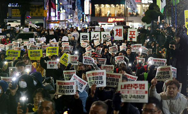 當地時間2024年12月4日,韓國民眾集會抗議戒嚴,要求尹錫悦下台。 視覺中國