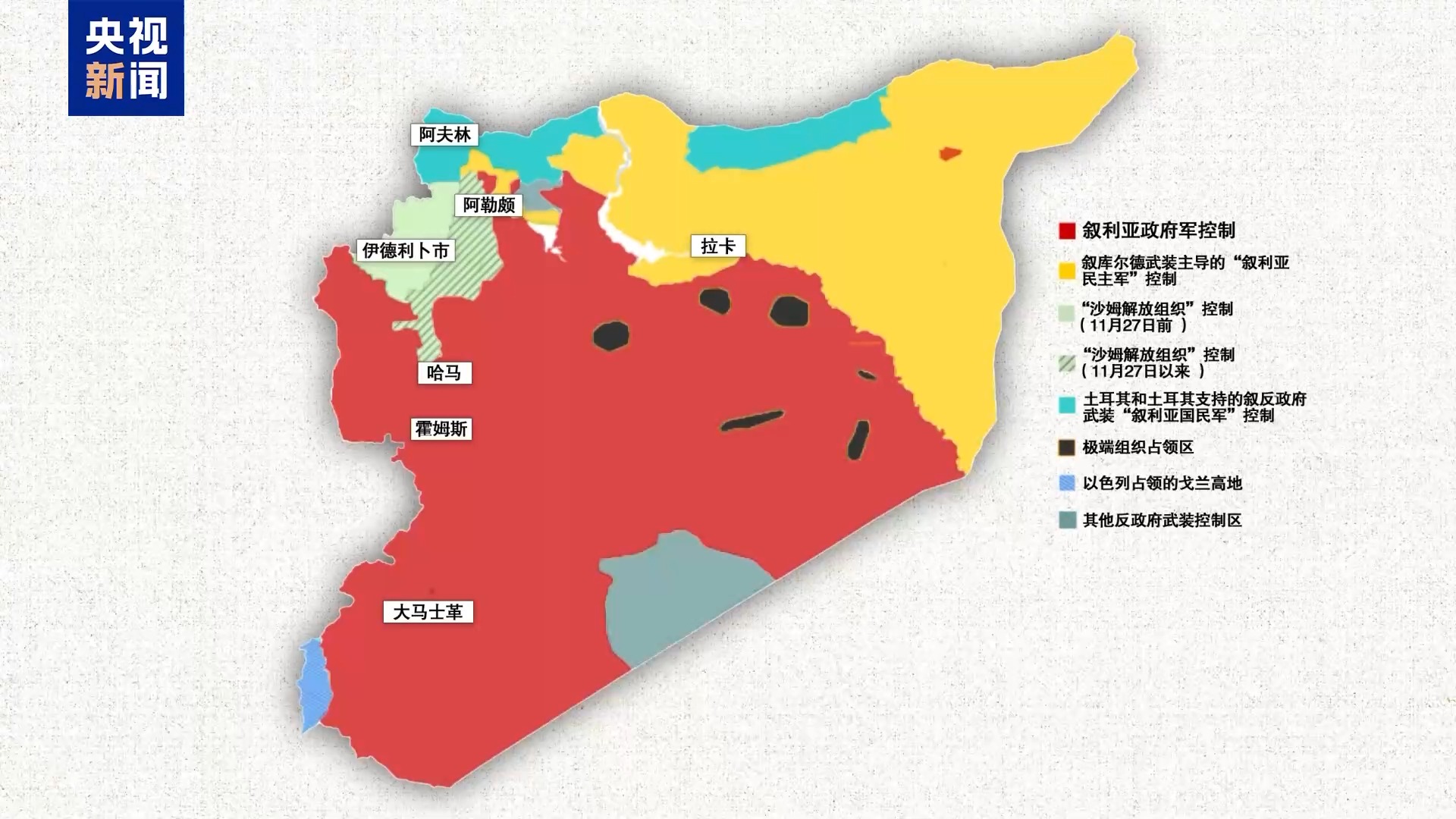 自當地時間11月27日發動突襲後,敍反政府武裝已接連拿下北部最大城市阿勒頗以及中部城市哈馬。大馬士革命懸一線,僅剩距離150公里的中部重鎮霍姆斯作為最後一道重要防線。