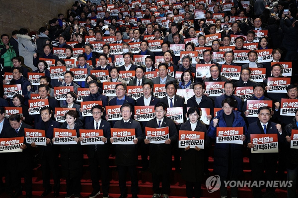 當天,在國會全體會議結束後,共同民主黨黨首李在明強烈譴責執政黨國民力量黨缺席總統尹錫悦彈劾案的表決,稱必將彈劾尹錫悦。