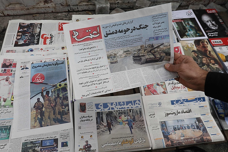 當地時間2024年12月8日,伊朗德黑蘭,報攤上放着當地報紙,頭條新聞報道敍利亞局勢。波斯文標題為:“大馬士革郊區的戰爭”。 視覺中國
