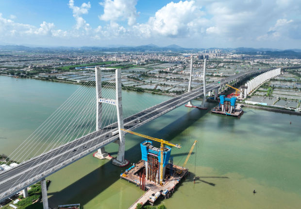 2024年9月1日,深江鐵路跨磨刀門水道主橋東主墩(左下)下橫樑澆築完成(無人機照片)。深江鐵路建成通車後,深圳、東莞、廣州、中山、江門這五座大灣區城市將更緊密地連接在一起,實現深圳前海自貿區與廣州南沙自貿區半小時高鐵互聯互通。