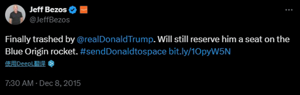 2015年,貝索斯在推特(現為X)發推稱,他的太空公司“藍色起源”(Blue Origin)會為特朗普保留一個座位。 社交媒體平台X
