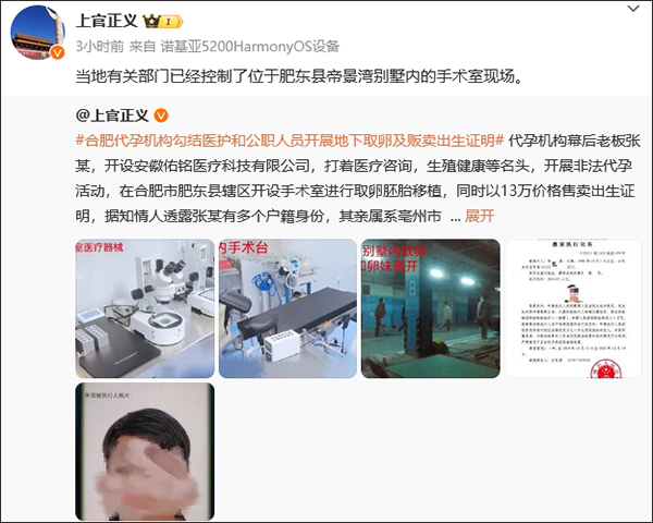 據此前報道,12月13日,打拐志願者@上官正義 發微博稱,安徽佑銘醫療科技有限公司打着醫療諮詢、生殖健康等名頭,開展非法代孕活動,在合肥市肥東縣轄區開設手術室進行取卵胚胎移植,同時以13萬元的價格售賣出生證明。
