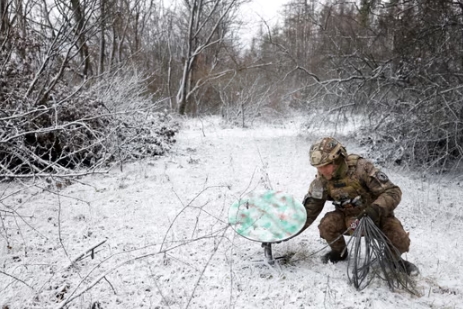 一名烏克蘭士兵在盧甘斯克展開“星鏈”終端。 路透社