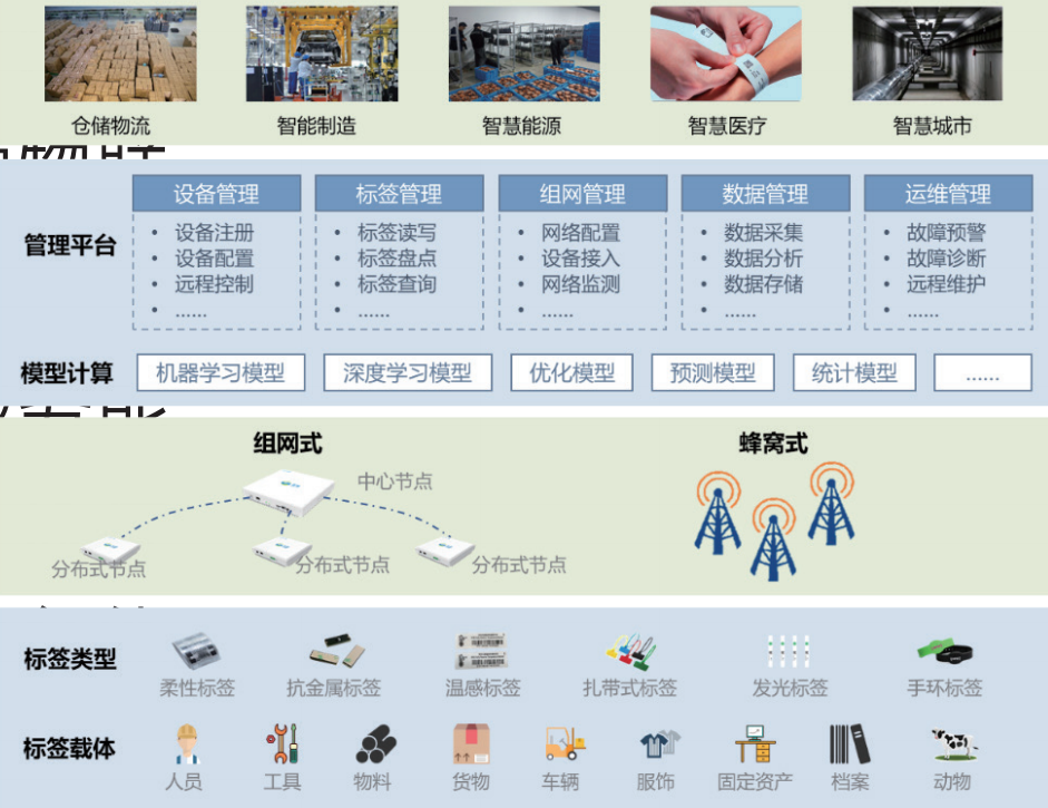 一是由無源物聯網標籤構成的“端”層,這些標籤無需外置電源,可以貼附或安裝在物品、車輛載具和人員上,且具備傳感能力,能夠監測數據;二是網絡層,無源物聯網網絡設備負責向無源物聯網標籤發射能量信號以供其工作,並接收標籤反射回的攜帶數據信號,之後通過有線或無線方式將數據傳送到無源物聯網管理平台;三是雲側,無源物聯網管理平台主要負責無源物聯網設備管理、終端數據的匯聚處理等,可實現對海量數據的快速處理和深度分析;四是應用層,基於無源物聯網數據,應用平台面向最終用户實現業務全流程管理,可將處理後的數據可視化、智能化,促進企業優化流程、提升效率,並做出更加精準的決策。