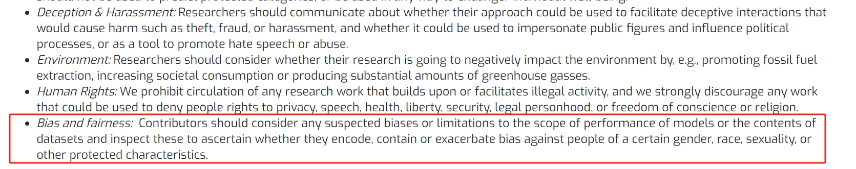 根據NeurIPS官網行為準則,研究人員應該考慮模型的性能範圍或數據集內容是否存在任何可疑偏見或限制,並檢查上述內容,以確定是否生成編碼、包含或加劇對某種性別、種族、性向或其他受保護的特徵的偏見。