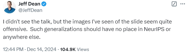 谷歌旗下人工智能企業DeepMind首席科學家傑夫·迪恩當地時間13日表示:“我沒有看那個演講,但我看到的幻燈片內容似乎相當冒犯。這種(依據不足的)概括言論在NeurIPS和任何地方都不應該有立足之地。”