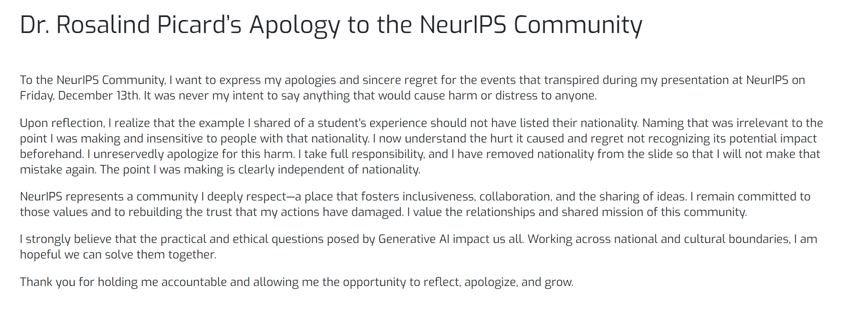 NeurIPS隨文轉發了皮卡德對NeurIPS社區的單獨道歉。