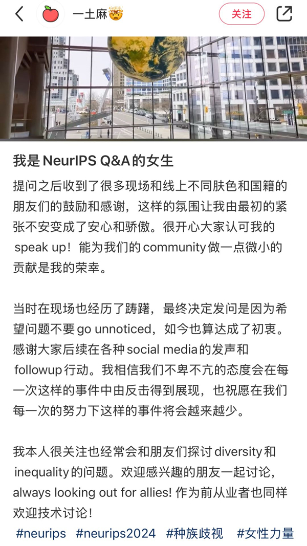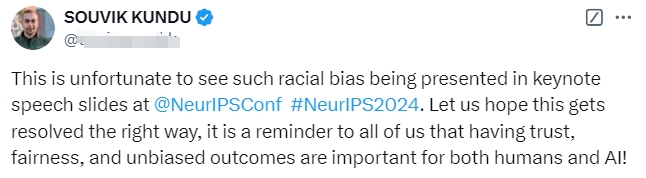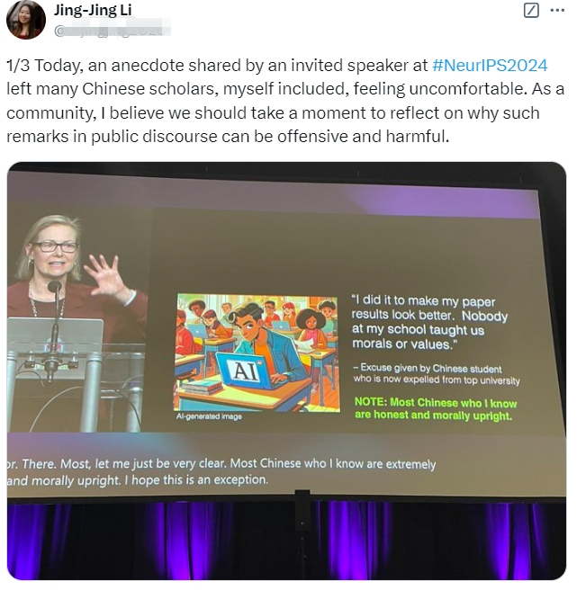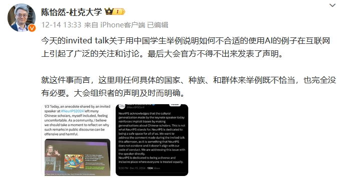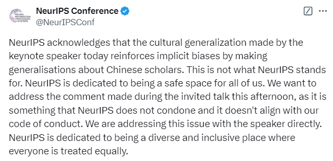 當地時間12月13日,NeurIPS迅速作出回應,在X平台發文稱,涉事教授當天主旨演講中所做的“文化概述”,包括對中國學者的概述“強化了內隱的偏見”,“這不是NeurIPS的立場……這是NeurIPS所不能容忍的,也不符合我們的會議行為準則。我們將直接與演講人討論這個問題。”