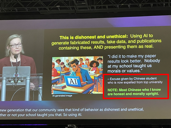 “‘我這麼做是為了讓論文結果看上去更好,我的學校沒人教我們道德或價值觀。’——一位中國學生的藉口,此人目前已被頂尖大學開除。”這是皮卡德主題演講幻燈片上的原文。