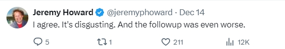 澳大利亞數據科學家、fast.ai聯合創始人傑裏米·霍華德(Jeremy Howard)認可迪恩的發聲:“我同意,太噁心了,後續的回應更是雪上加霜。”