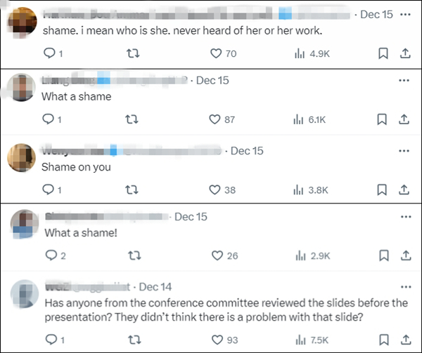 在問答環節,一名中國女性參會者有理有據地指出了皮卡德言論存在無意識偏見和種族主義之嫌,贏得現場掌聲。明顯慌亂的皮卡德在狡辯了一會後,答應刪除幻燈片中存在問題的表述。