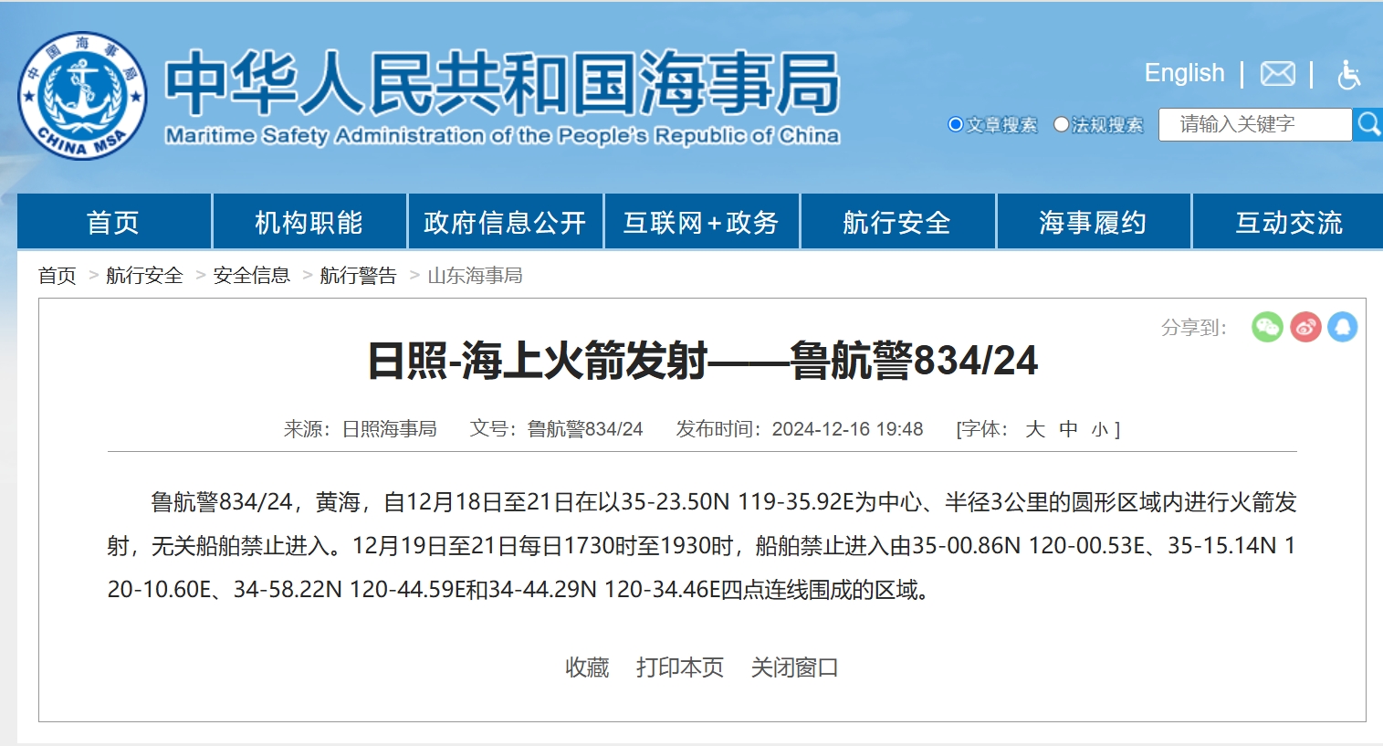 魯航警834/24,黃海,自12月18日至21日在以35-23.50N 119-35.92E為中心、半徑3公里的圓形區域內進行火箭發射,無關船舶禁止進入。12月19日至21日每日1730時至1930時,船舶禁止進入由35-00.86N 120-00.53E、35-15.14N 120-10.60E、34-58.22N 120-44.59E和34-44.29N 120-34.46E四點連線圍成的區域。