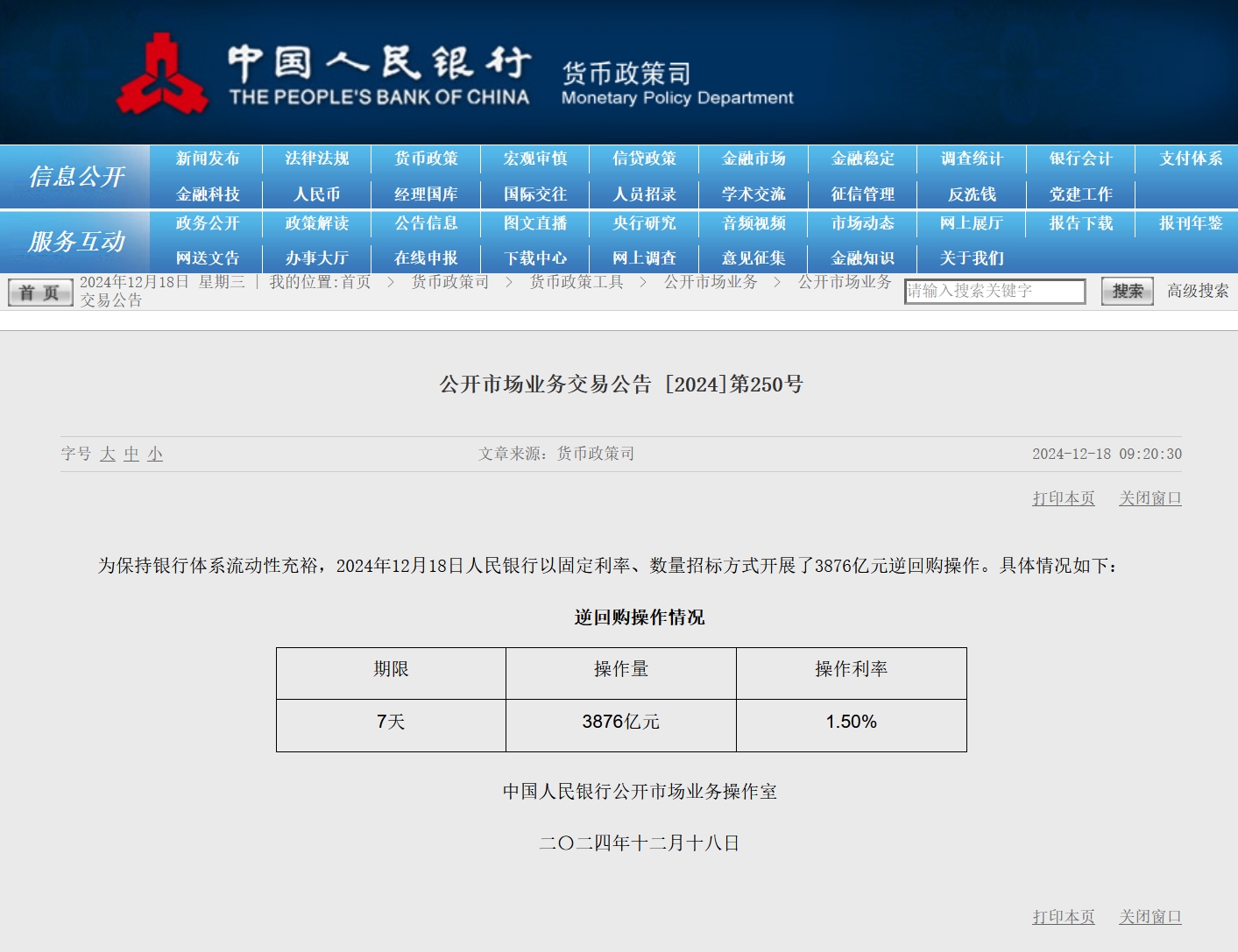 中國人民銀行網站12月18日發佈《公開市場業務交易公告 [2024]第250號》稱,為保持銀行體系流動性充裕,2024年12月18日人民銀行以固定利率、數量招標方式開展了3876億元逆回購操作,期限為7天、操作利率1.50%。因當日有786億元7天期逆回購到期,因此實現淨投放3090億元。