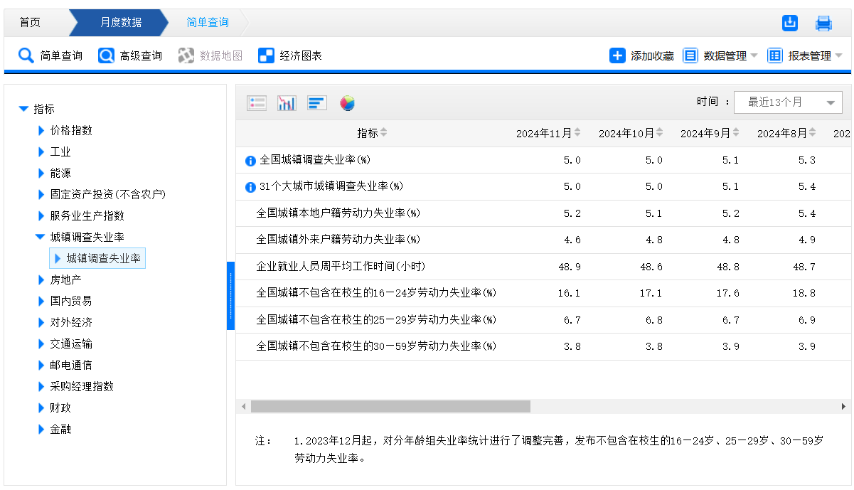 據國家統計局官方網站最新發布的數據,11月份,全國城鎮調查失業率為5%,不包含在校生的16-24歲勞動力失業率為16.1%,不包含在校生的25-29歲勞動力失業率為6.7%,不包含在校生的30-59歲勞動力失業率為3.8%。