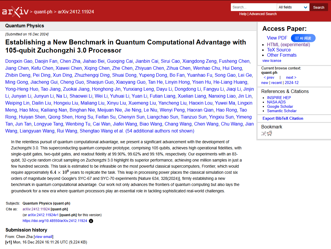 這篇論文的標題為《使用105量子比特“祖沖之三號”處理器建立量子計算優勢的新基準測試》(Establishing a New Benchmark in Quantum Computational Advantage with 105-qubit Zuchongzhi 3.0 Processor),朱曉波、潘建偉為論文通訊作者。中國科學技術大學、合肥微尺度物質科學國家研究中心、中國科學院量子信息與量子科技創新研究院上海科學研究中心等共9家科研機構的共154名科研人員參與了本次研究。