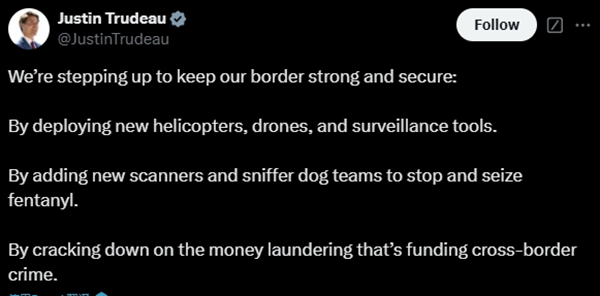特魯多也在社交媒體平台X上發文為加拿大政府的13億加元支出計劃辯護,稱“我們正在加緊保持我們的邊境穩固和安全”。