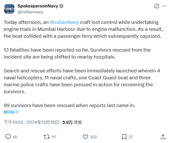 印度總理莫迪當地時間18日晚間則在“X”上發文表示:“孟買發生的沉船事故令人悲痛。我向遇難者家屬表示慰問。”